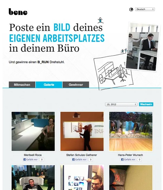Entweder direkt in der Facebook App oder zum Beispiel mit dem Smartphone vom Messestand aus per E-Mail konnte ein Foto vom Bene Messestand auf der Orgatec in der Applikation hochgeladen werden. Mit diesem nahm man automatisch am Gewinnspiel teil. Am Ende des Monats wurde aus allen eingereichten Bildern ein Gewinner gezogen, die sich über Bene Produkte als Gewinnpreise freuen konnten.