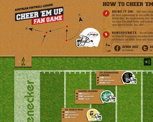 Für den Auftakt der AFL Meisterschaft wurde das bereits im Vorjahr entwickelte Fangame Cheer ‘em up neu angepasst. Via Facebook und Twitter können die Fans dieses mal ihre Lieblingsmannschaften der Austrian Football League anfeuern und so die wichtigen Yards erkämpfen.