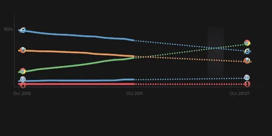 Zurück zu den Browsern, hier kristallsiert sich ein starker Trend heraus. Der Internet Explorer schafft es auch mit seinen neuen Browsern nicht mehr Marktanteile zu gewinnen, zu groß war der Schaden durch alte Modelle. Besonders spannend ist, dass der Star Firefox auch langsam an Beliebtheit verliert. Ich könnte mir vorstellen, daß dies an der teilweise schlechten Performance liegt. Er ist doch ein ordentlicher Ressourcenfresser. Doch jetzt kommt die Überraschung. Mein Lieblingsbrowser Chrome könnte nach Prognosen 2012 die größte Verbreitung haben. Für mich hat Chrome deutlich die beste Performance, im speziellen bei JavaScript. Das jeder geöffnete Tab isoliert in einem CPU Prozess läuft, ist auch genial, keine Gesamtabstürze mehr. Der Kritikpunkt Datenschutz (wg. Google)löst bei mir keine Angst aus. Achja, da wären noch für die Macjünger Safari, welcher mit Opera herumgrundelt, obwohl Safari auf dem iPhone installiert ist.