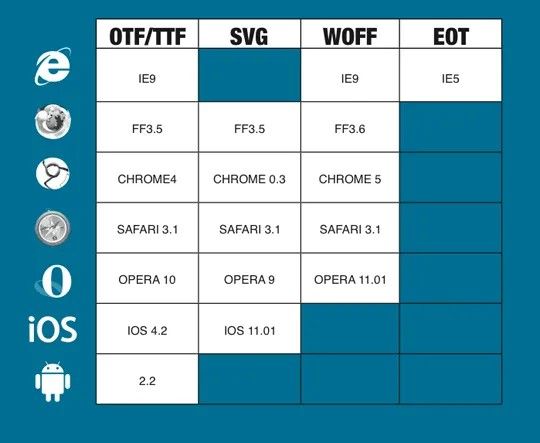 Das Schriftformat das von den meisten Browsern unterstützt wird ist TTF, gefolgt von SVG und WOFF. SVG wird aber von keiner Version des Internet Explorers unterstützt. Alle Versionen des Internet Explorers unter der Version 9 unterstützen lediglich ein einzigen Format – EOT. Dieses Format wurde von Microsoft entwickelt und wird somit auch nur vom IE unterstützt. Bis jetzt unterstützen die bekanntesten mobilen Browser (iOS und Android) nur TTF.