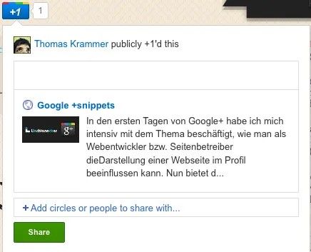 In den ersten Tagen von Google+ habe ich mich intensiv mit dem Thema beschäftigt, wie man als Webentwickler bzw. Seitenbetreiber die Darstellung einer Webseite im Profil beeinflussen kann. Nun bietet der Google Webmaster Central Blog eine offizielle Antwort auf die Frage. Das Zauberwort heißt +Snippets und basiert auf dem Konzept von Microdata, das auf schema.org im Detail beschrieben wird.