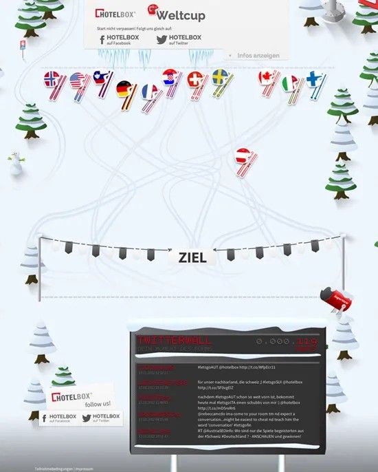 Parallel zum Ski-Weltcup ist seit 9. November der Hotelbox Weltcup im Gange. Zwölf Nationen stehen am Start und können per Tweets und Facebook Shares wichtige Abfahrtskilometer sammeln. Das interaktive Wettrennen soll den Augenmerk auf Hotelbox richten und die bestehenden Facebookfans zu Botschaftern der Marke machen.