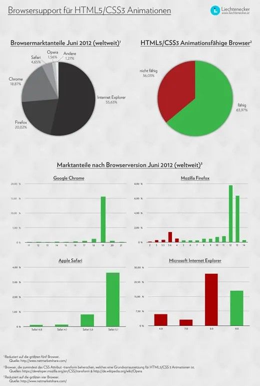 Ein großes Problem bei der Verbreitung von HTML5 & CSS3 Animationen ist momentan noch die Unterstützung durch Browserhersteller. Eine Recherche der momentanen Marktanteile am Browsermarkt (nach Browserversion) verknüpft mit der Fähigkeit, das -transform-Attribut interpretieren zu können findet sich in nachfolgender Grafik.