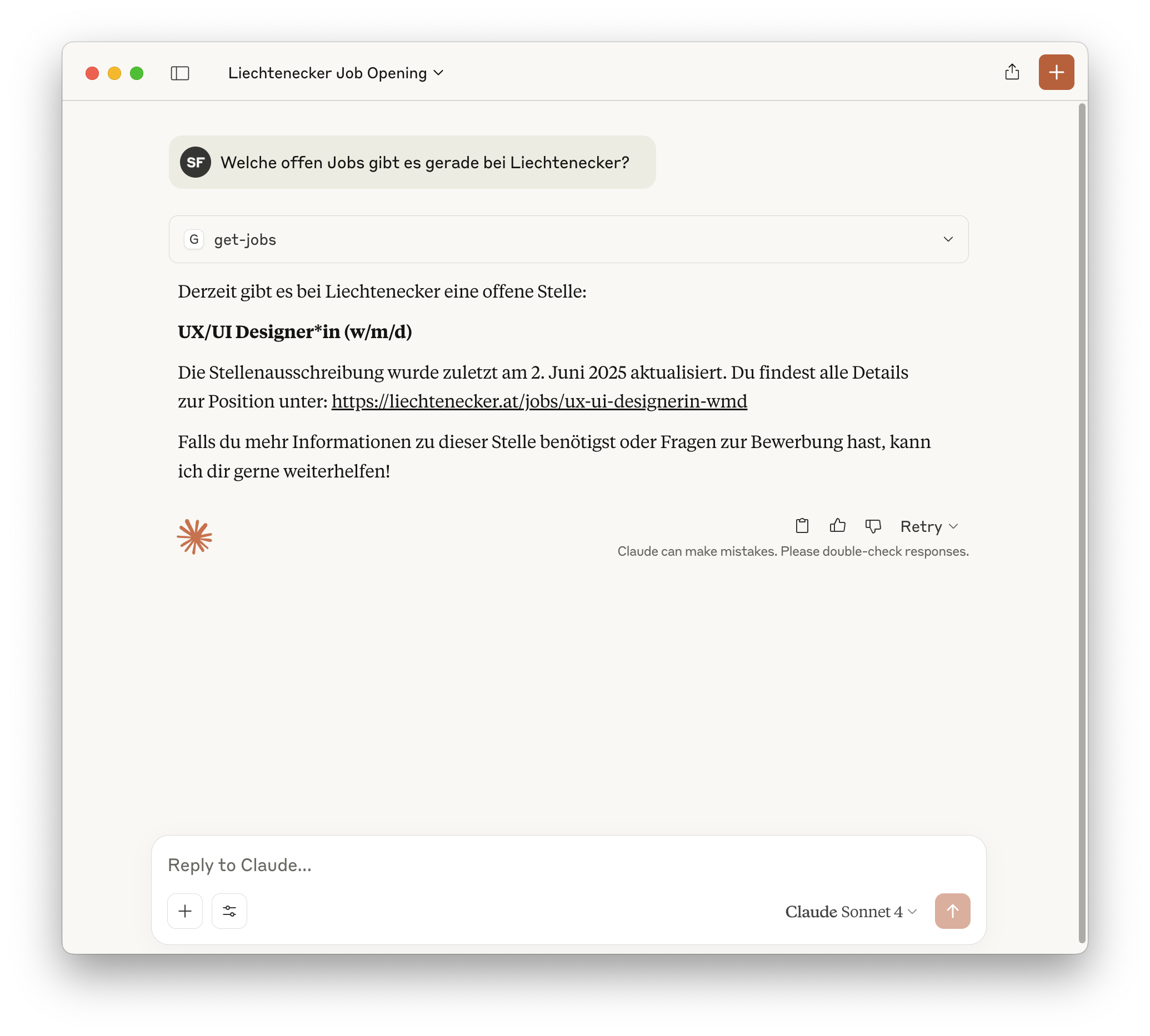 “Hey Claude, welche Jobangebote gibt es denn gerade bei Liechtenecker?”