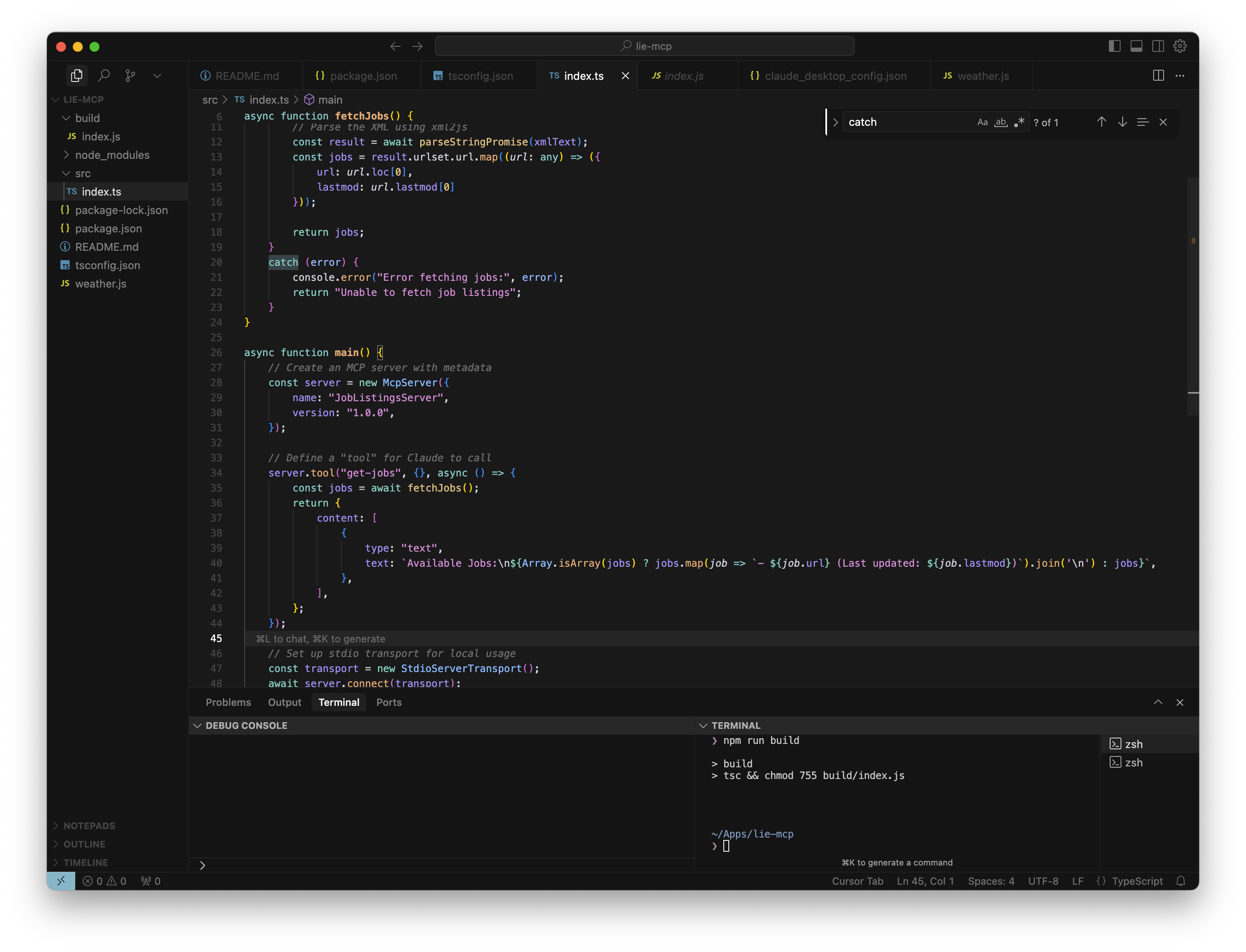 Einen eigenen MCP Server aufzusetzen geht in wenigen Schritten - ein paar Konfigurationsdateien (wir schreiben unseren Server in TypeScript, die dazu nötigen Libraries sind aber auch für viele anderen Sprachen verfügbar) erstellen und angeben, wo Claude seine Informationen herbekommen soll.