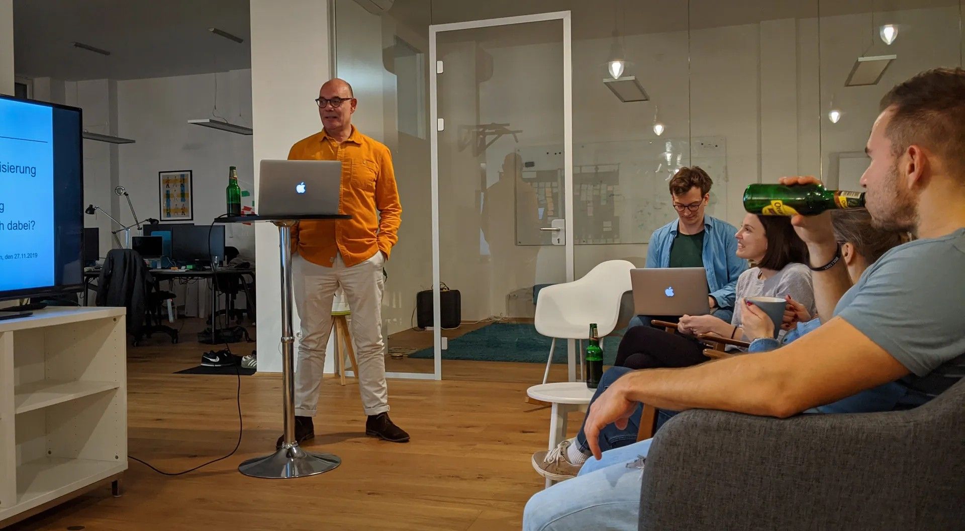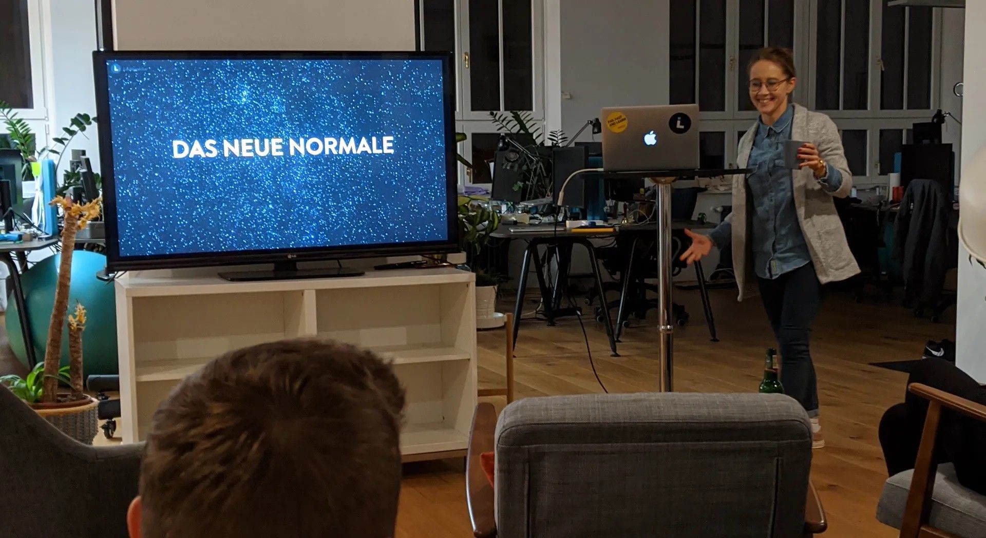 Die Sitzgelegenheiten werden arrangiert. Maja gibt Auskunft über die genaue Zahl der angemeldeten Gäste. Zu viel Körpernähe wollen wir ihnen ja nicht zumuten, aber viele leere Plätze zwischendrin sind auch ungemütlich. Der Bildschirm wird aus dem Meetingraum geholt. Ganz vorsichtig. Wirklich ganz vorsichtig, denn bei so einem Transport hat es schon mal ein Malheur gegegeben (die treuen Instagram-Follower wissen Bescheid).