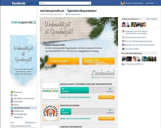 Weihnachtszeit ist Spendenzeit! Etwas Gutes zu tun, ist mit der Spendenbarometer Facebook App schnell und einfach möglich: Fans von meinespende.at auf Facebook können durch einfaches abgeben ihrer Stimme an eine meinespende-Organisation helfen. An die Organisation mit den meisten Stimmen spendet BAWAG P.S.K. 50 Cent pro abgegebenem Voting. Nach dem Voting kann man seine gute Tat auf der eigenen Pinnwand posten und natürlich Freunde einladen für den guten Zweck.