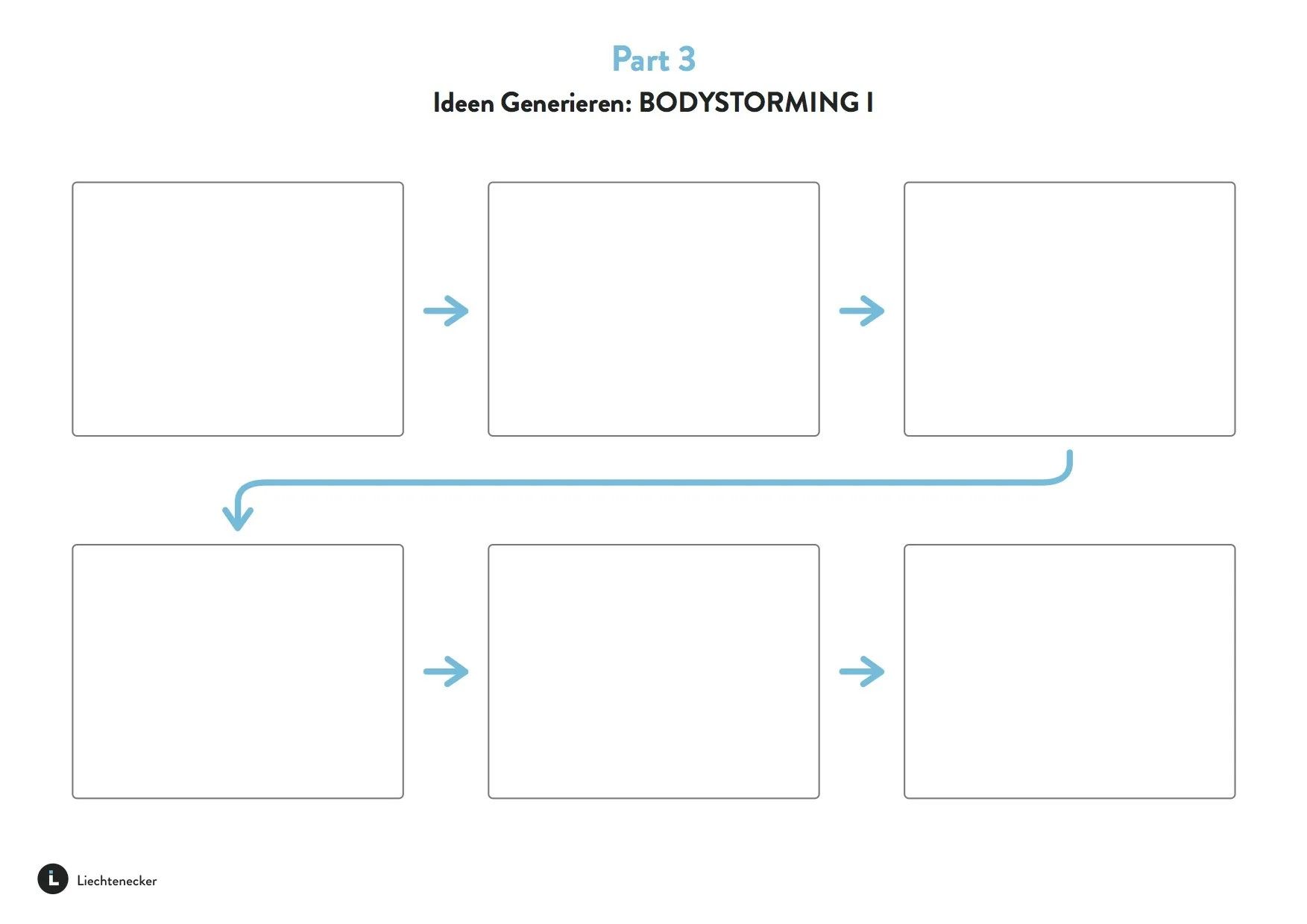 In Schritt 3 wurden mögliche Lösungsideen für das definierte Projektziel generiert. Dafür sollte jeder Teilnehmer zuerst für sich alleine Lösungsideen entwickeln und diese dann an der anderen Person testen. Hierfür kam die Methode „Bodystorming“ zum Einsatz.