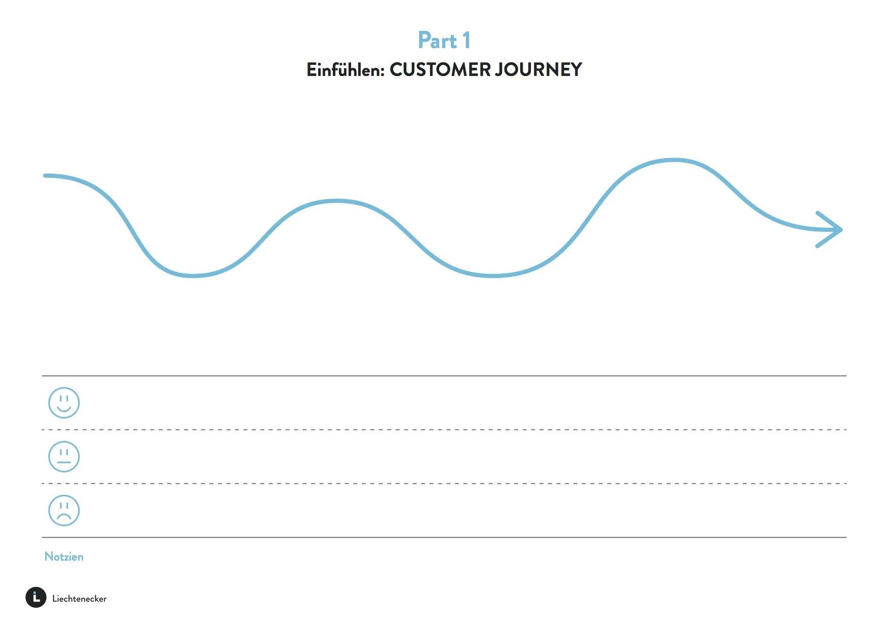 Bei dieser Methode gibt es einen Interviewer und einen Befragten. Der Befragte wird vom Interviewer dazu angeleitet ihm seine „Geschichte“ zum Thema Versicherung schrittweise zu erzählen. Der Interviewer soll die einzelnen Steps in der Geschichte (z.B. erster Kontakt mit dem Makler, Beratungsgespräch, Abschluss etc.) einzeichnen. Dabei dient ihm die blaue Linie in der Vorlage (siehe Grafik oben) als Anhaltspunkt, um eine zeitliche Abfolge von links nach rechts darzustellen. Bei jedem einzelnen Schritt soll der Interviewer notieren, wie sich der Befragte in dieser Situation fühlt. Diese Übung schult besonders die Empathiefähigkeit, da der Interviewer nicht direkt nach der Gefühlslage fragen darf. Es geht darum aktiv zuzuhören und den Befragten durch offene Fragen zum Erzählen anzuregen. Dabei ist es besonders wichtig an jenen Stellen nachzufragen, die einen irritieren oder einem im ersten Moment nicht ganz klar sind. Dadurch werden schnell tiefer liegende Probleme erkennbar.