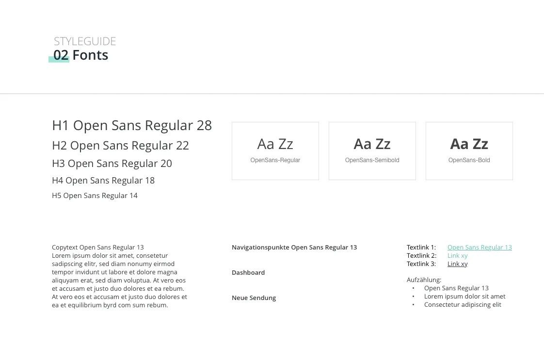 Um ein konsistentes visuelles Erlebnis zwischen der Website und dem neuen Tool gewährleisten zu können, sind wir von der Grundfarbe – die auch im Logo verwendet wird – ausgegangen und haben die anderen Farben passend dazu ausgewählt. Die dunklen Grautöne helfen dem neuen Tool dabei Kontraste hervorzuheben (zB.: Headerleiste, Quick-Funktionen und Tooltips heben sich von den hellen anderen Elementen gut ab). Als neue Font-Familie haben wir uns für Open Sans entschieden. Diese funktioniert sowohl sehr gut innerhalb von informationsdichten Tabellen als auch für große Titel und Überschriften.