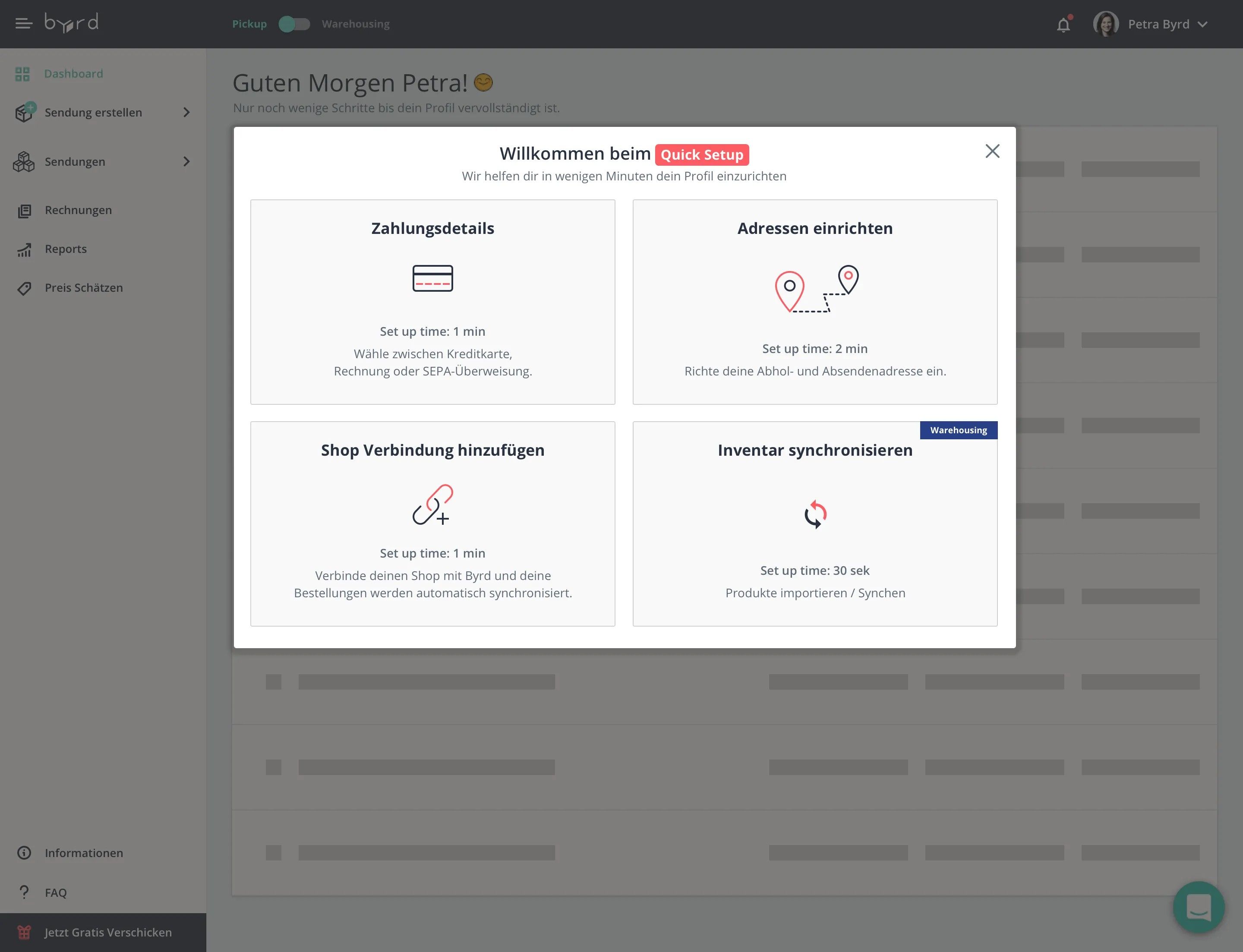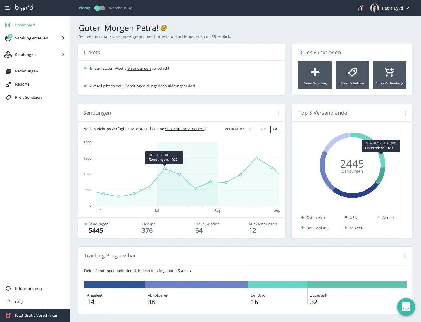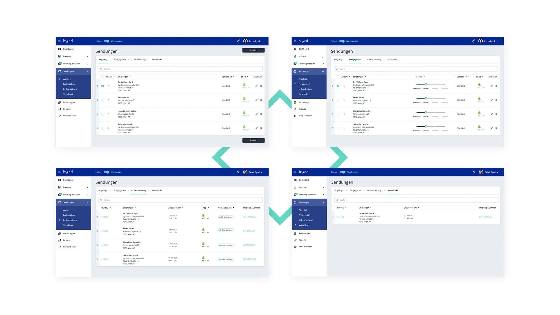 AUFGABEWir kümmerten uns dabei um die Modernisierung, Neukonzeption und Neugestaltung der Web-Applikation, mit der Kunden Sendungen erstellen, verwalten und abholen lassen, sowie um die Erweiterung der App durch den Warehousing-Service. Im Bereich der Lagerhaltung war es byrd besonders wichtig, Transparenz in den Prozess der Einlagerung von Waren zu bringen. Kunden sollen von nun an nicht nur live den Verpackungs- und Versandprozess ihrer Sendungen tracken, sondern auch jederzeit den Lagerbestand ihrer Ware in Echtzeit einsehen können. Ein weiteres Anliegen war es, die Dauer für das Abschließen einer Bestellung zu reduzieren und die Abläufe generell zu vereinfachen.