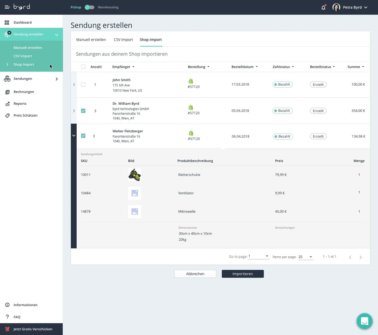 SendungAuf das schnelle und einfache Erstellen neuer Sendungen wurde besonderen Wert gelegt. Dank der neuen UX ermöglichen wir es dem User, mit wenigen Klicks eine Abholung anzufordern und eingelagerte Waren zum Versand freizugeben. Zur Erstellung kann man entweder über das Menü oder über einen prominenten CTA am Dashboard gelangen. Für das Anlegen einer neuen Sendung gibt es mehrere Möglichkeiten: Manuell, über den CSV Import oder bestehende Sendungen aus einem Shop importieren.