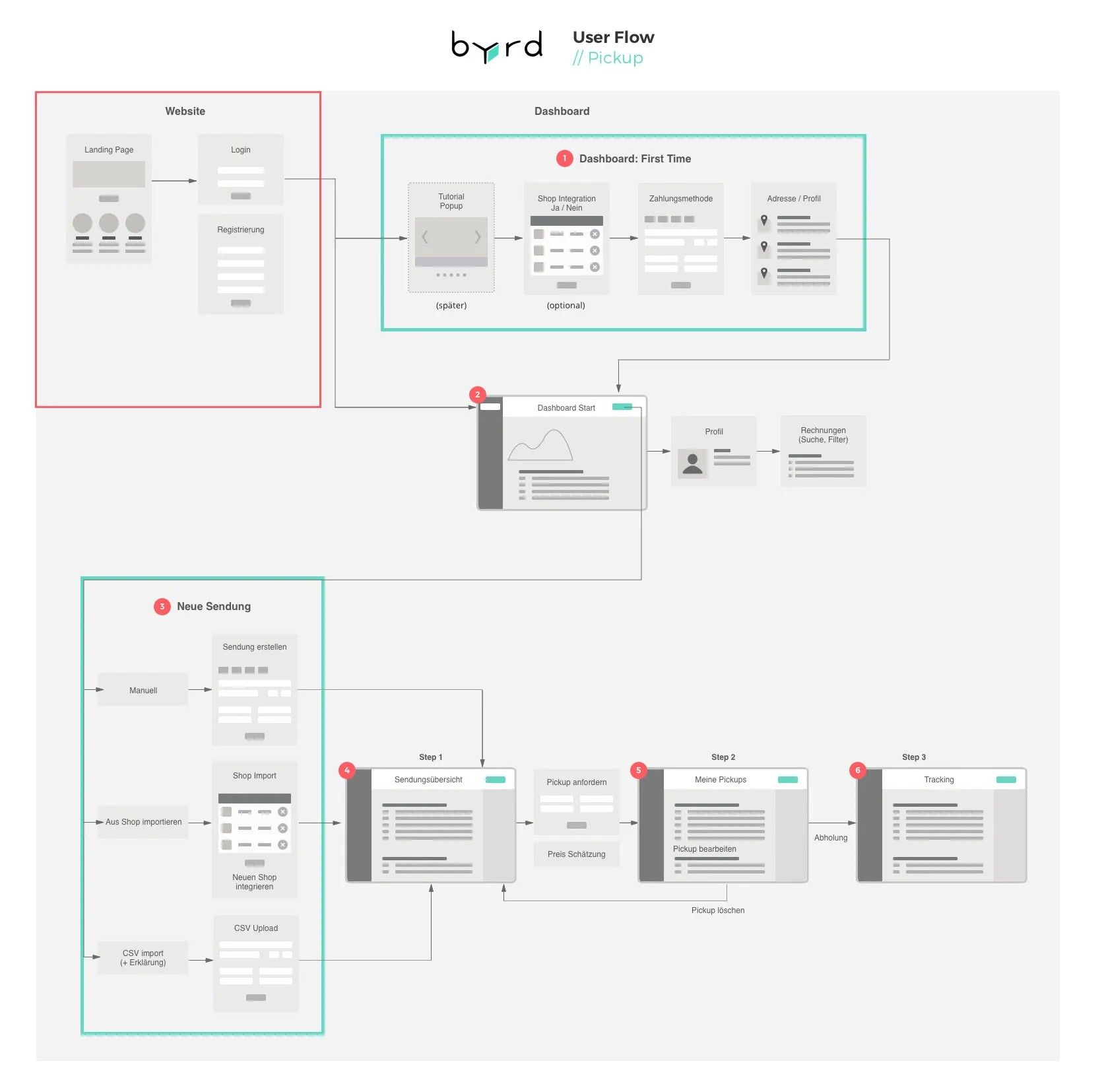 User FlowsBasierend auf der Empathy Map und weiteren Insights aus dem Workshop erstellten wir User Flows für beide Sparten (Pickup und Warehousing). Diese halfen uns dabei herauszufinden, ob wir im Prozess nichts übersehen hatten bzw. ob der Ablauf logisch und vollständig ist. Aus den Flows entwickelten wir dann erste klickbare Prototypen.