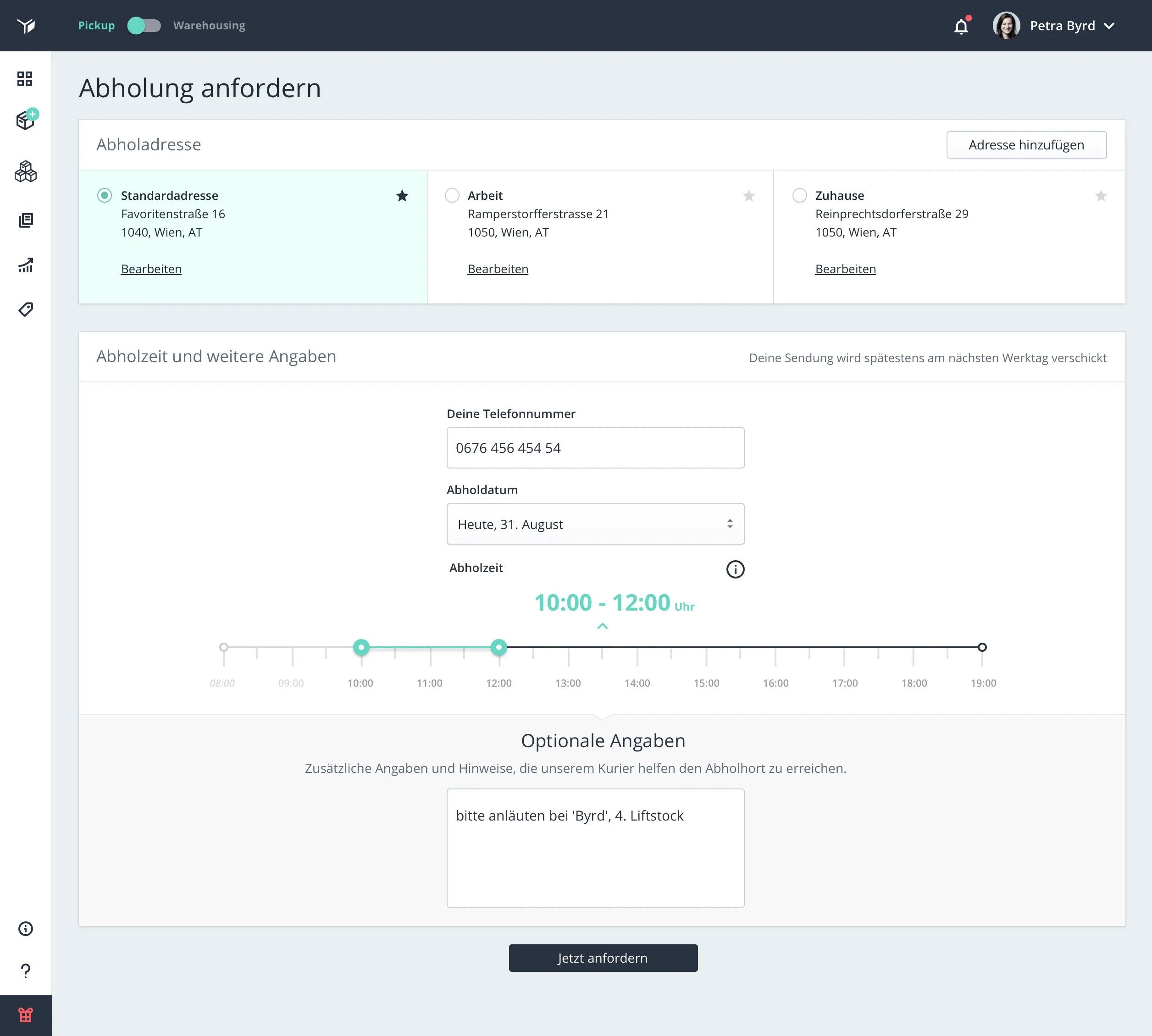 AnfordernNachdem man eine neue Sendung erstellt hat, kann man dafür einen Pickup anzufordern. Damit die Abholung rasch und problemlos funktioniert, hat der User die Möglichkeit ein Wunschzeitfenster und Zusatzinformationen (mit einer Vorlaufzeit von 2 Stunden) anzugeben.