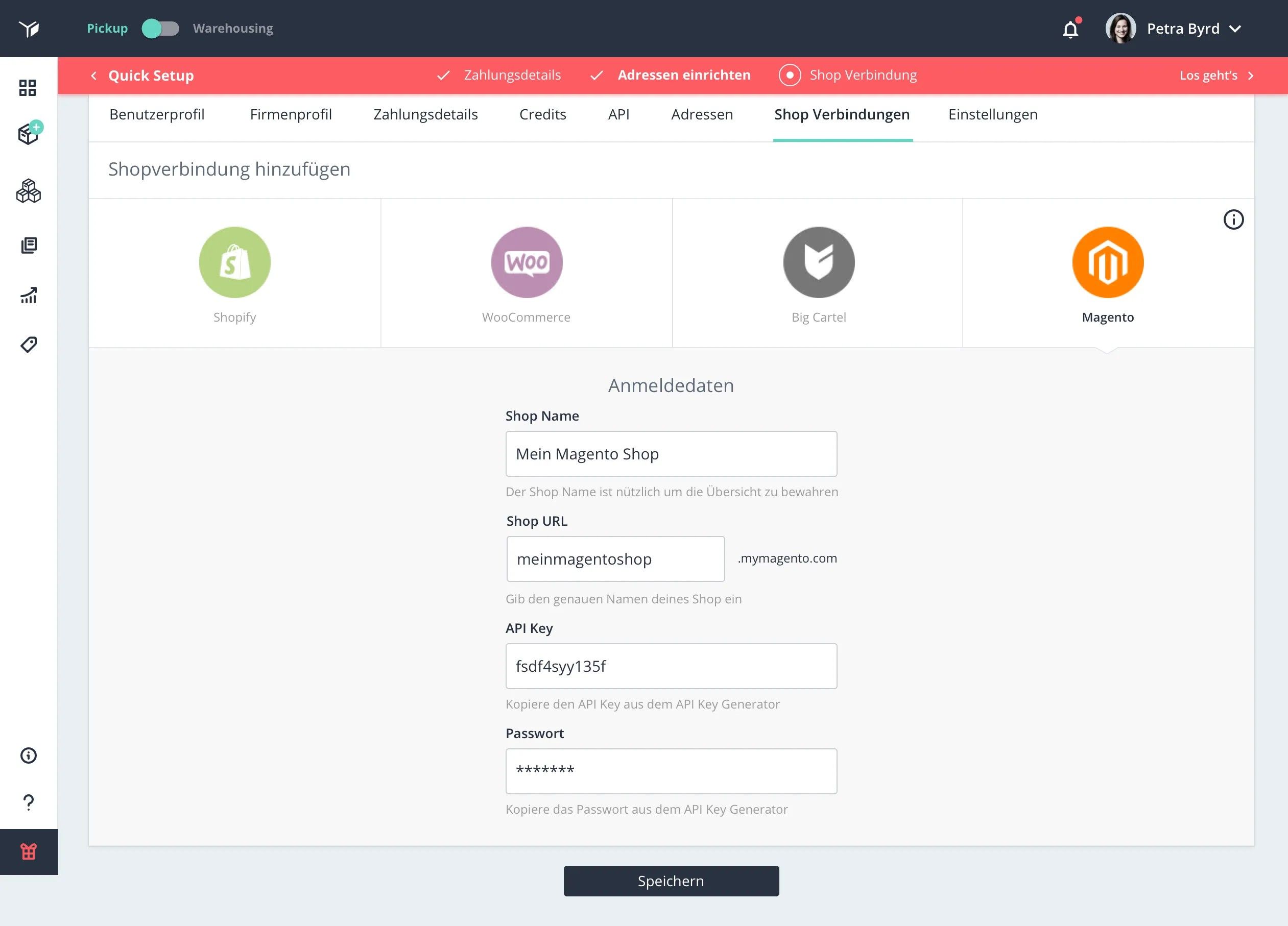 SETUPNutzt ein Kunde zum Ersten Mal das Tool, lernt er durch einen Wizard die Grundfunktionen kennen. Der User wird dazu aufgerufen, seinen Shop zu integrieren, Zahlungseinstellungen vorzunehmen und sein Profil zu konfigurieren.
