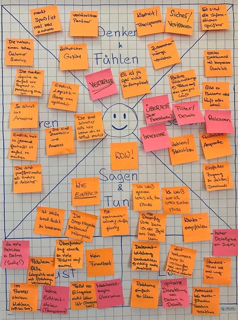 WORKSHOPUm den Kunden besser zu verstehen entwickelten wir in einem gemeinsamen Workshop unter anderem eine Empathy Map, auf der schnell ersichtlich wurde, was den Kunden besonders wichtig ist: Werte wie Sicherheit, Klarheit und Transparenz tauchten hier genauso auf, wie auch beispielsweise der Wunsch nach einer simplen Bedienung und Verlässlichkeit. Dafür stellten wir uns unter anderem folgende Fragen: Welche Erwartungen hat der User an byrd? Was denkt er über byrd? Was verschafft ihm Lust und was Frust im Umgang mit dem Tool?