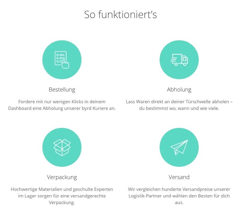 FULLFILLMENTÜber diesen neuen Geschäftszweig können Businesskunden ihre Waren in Lagerhäusern von byrd in Wien und Berlin einlagern und verwalten. Sie können online Lagerplätze buchen, die Verfügbarkeit ihrer Produkte einsehen und, im Falle einer Bestellung, diese Produkte direkt aus dem Lager fachgerecht verpacken lassen und mit dem günstigsten Anbieter versenden.