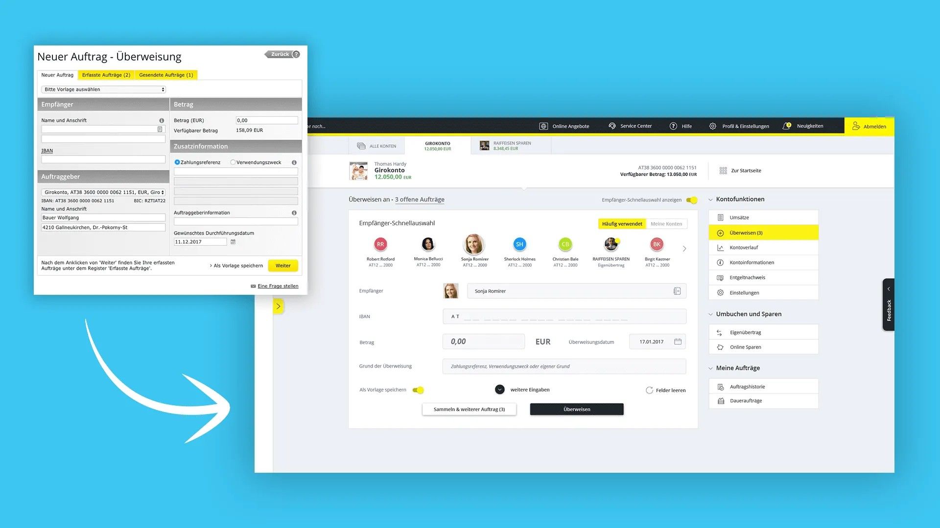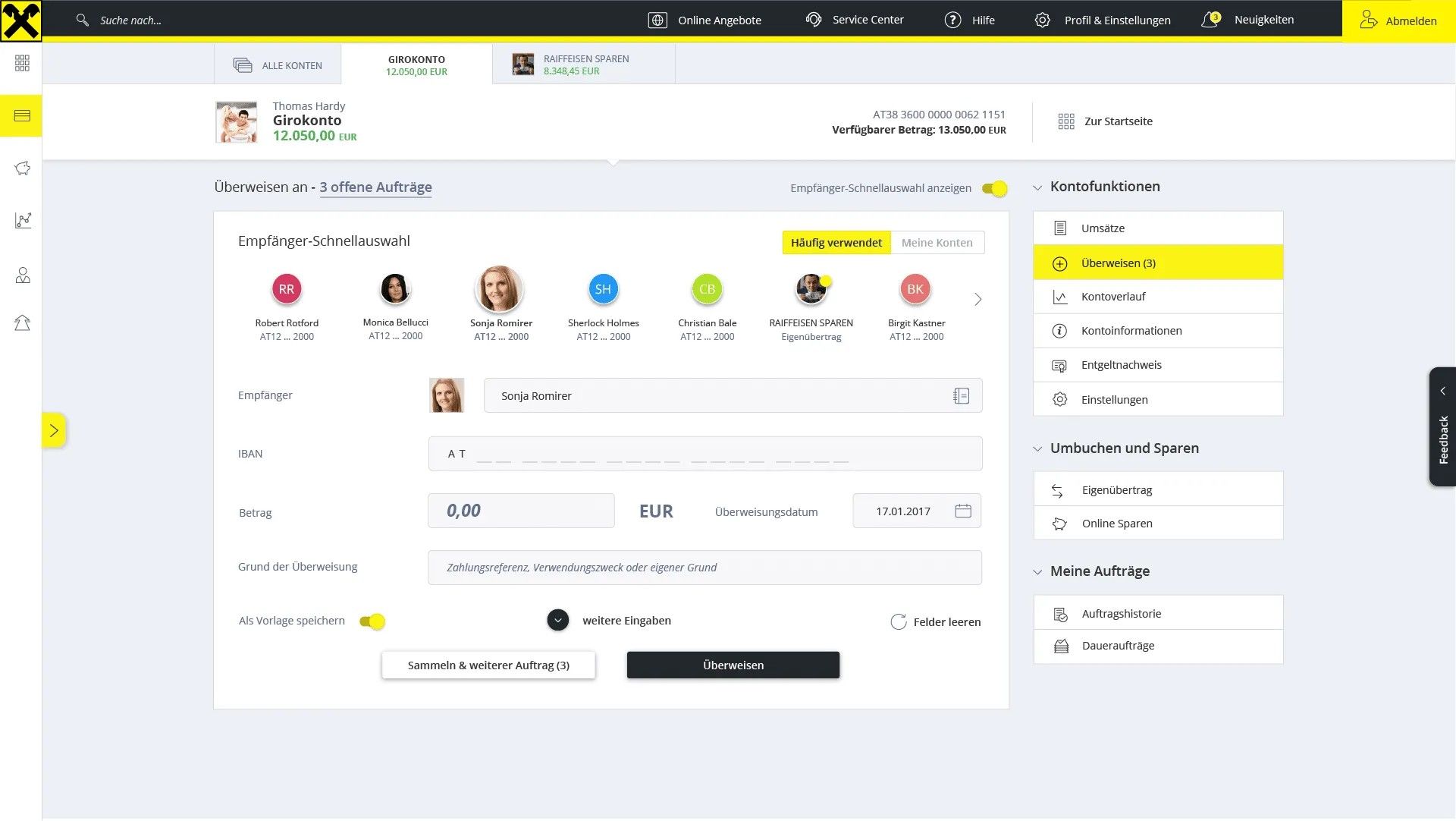 Eine Schnell-Empfängerauswahl, welche sich selbst aus den am häufigsten verwendeten Empfängern bildet, ermöglicht das automatische Ausfüllen des Überweisungsformulars mit einem Klick.