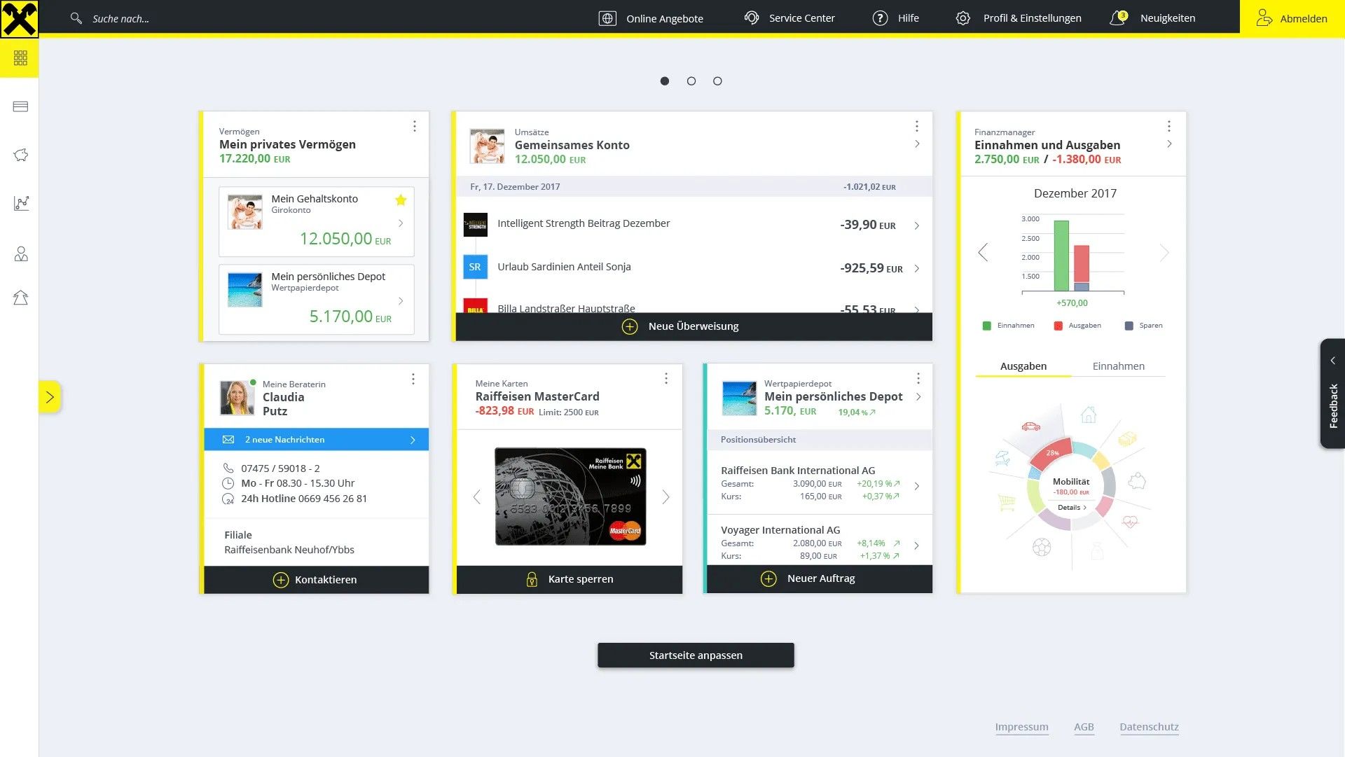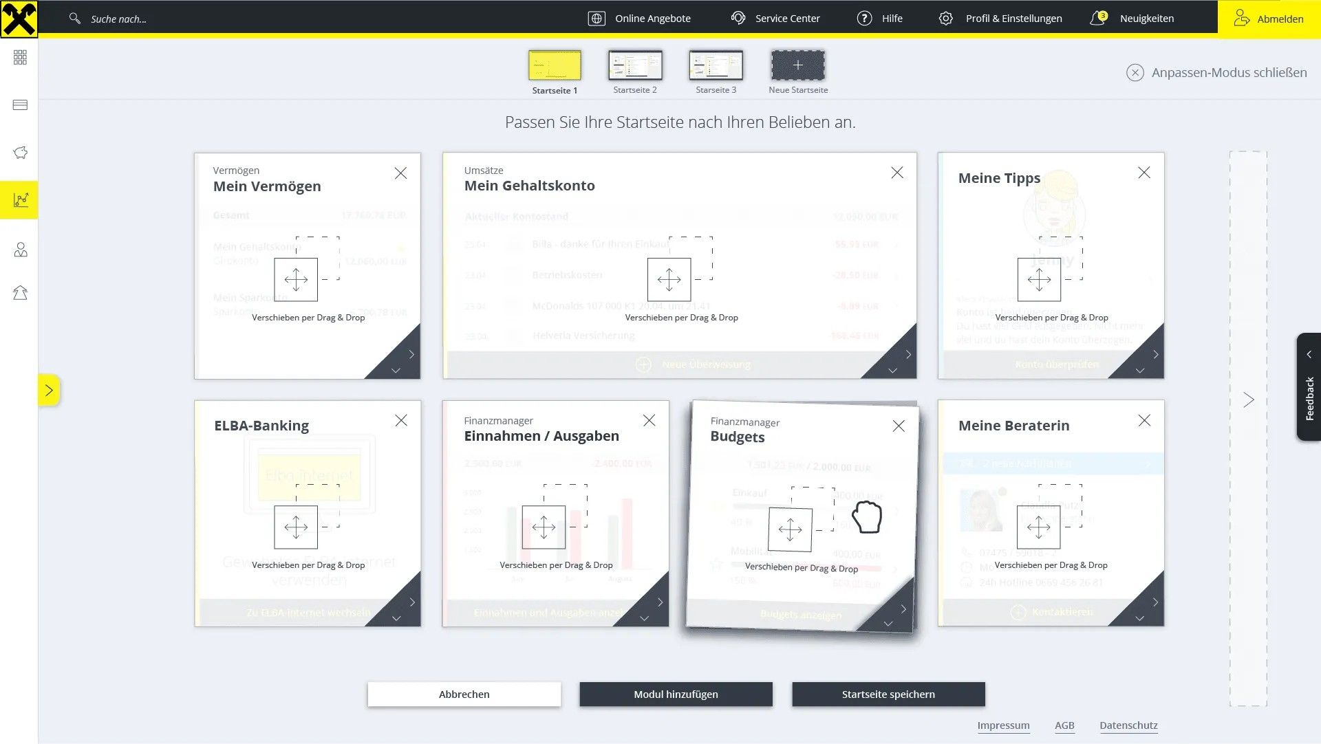 Welche Module auf der Startseite angezeigt werden sollen, kann jeder User selbst konfigurieren, ebenso die Anordnung, Größe, farbliche Kennzeichnung und einiges mehr. Startseite und Widgets sind individuell anpassbar, damit jeder seine optimale Bankingzentrale schaffen kann.