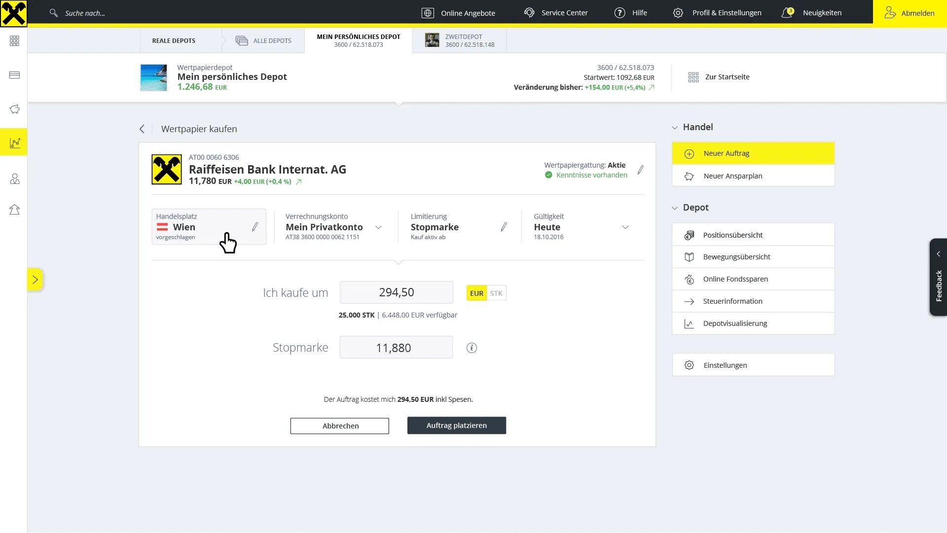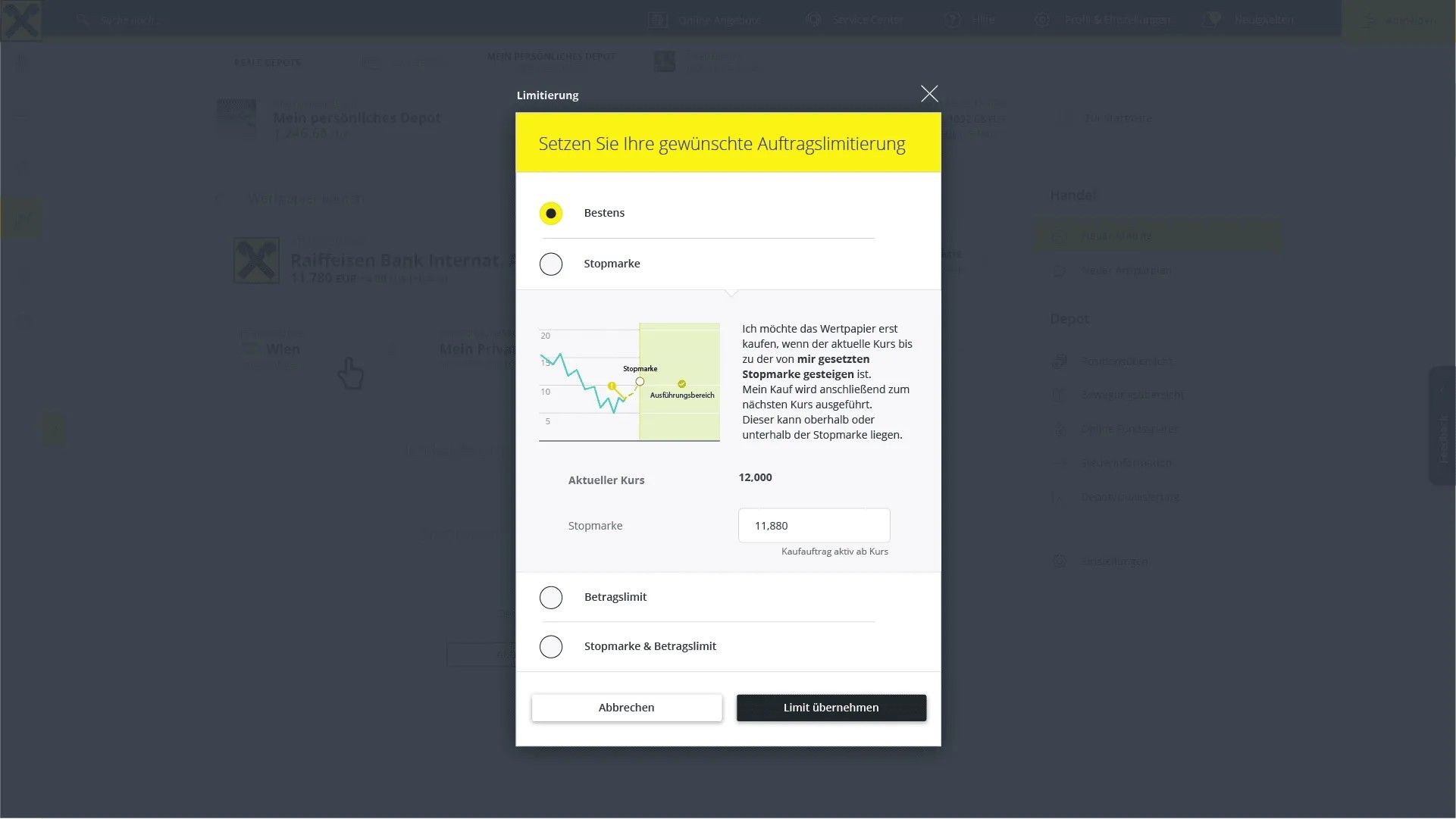 Die Einstellungen Verrechnungskonto, Limitierung, Handelsplatz und Gültigkeit können vorkonfiguriert werden bzw. merkt sich das System die meistverwendete Konfiguration. Trotzdem können sie jederzeit komfortabel in der Maske geändert werden. Der Fokus jedoch bleibt stets auf den wichtigsten Eingaben: Stückzahl und Limitierung.