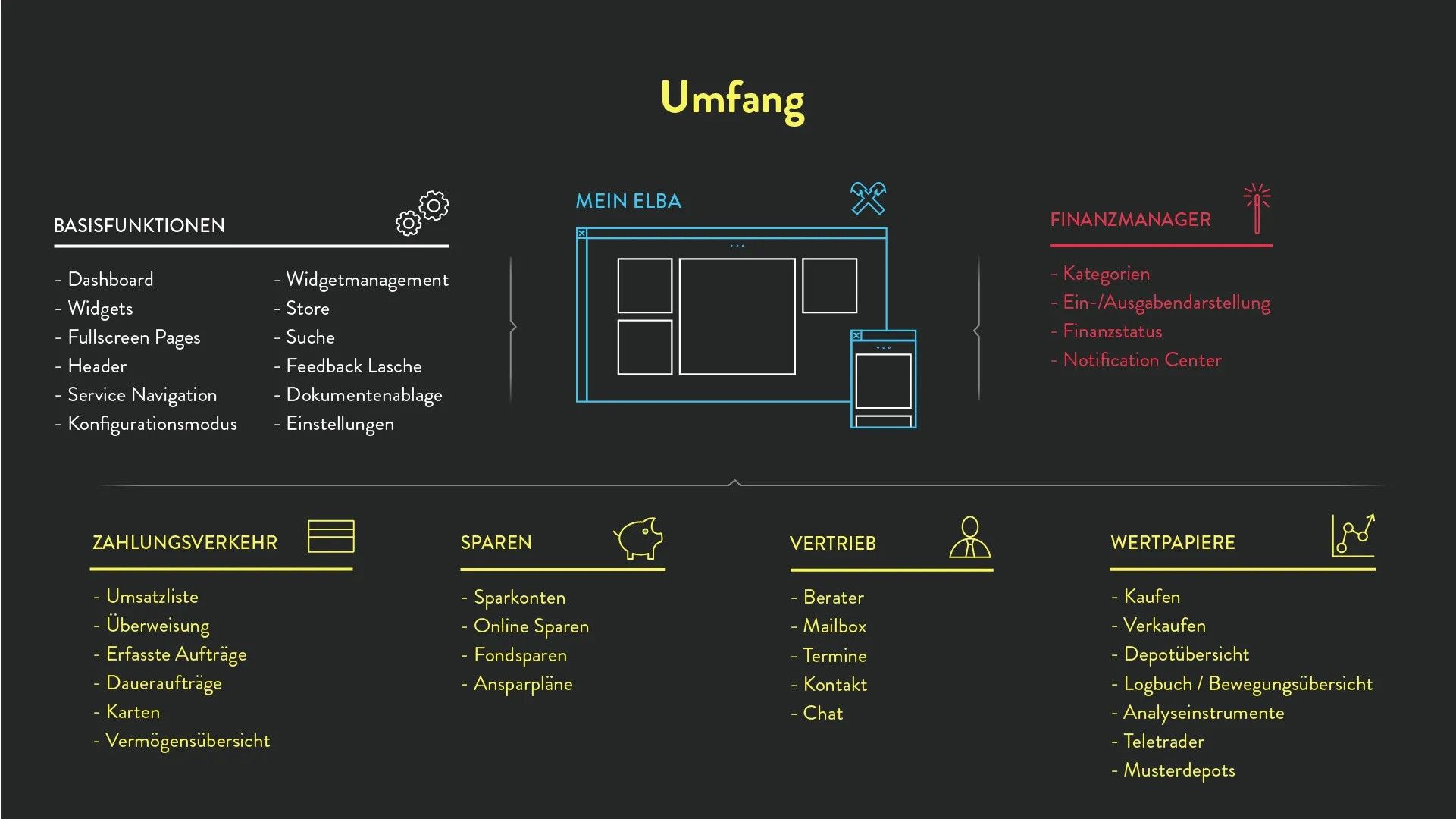 Das Schwierige daran war, dass wir zu Beginn jedoch nicht alle Themen kannten. Neben den üblichen Funktionen wie Überweisungen, Umsatzlisten, Sparübersichten und Wertpapierhandel gab es noch viel viel mehr, was jedoch erst im Laufe des Projektes genauer betrachtet werden konnte. Daher mussten wir zu Beginn schon mit großer Weitsicht an die Konzeption herantreten.