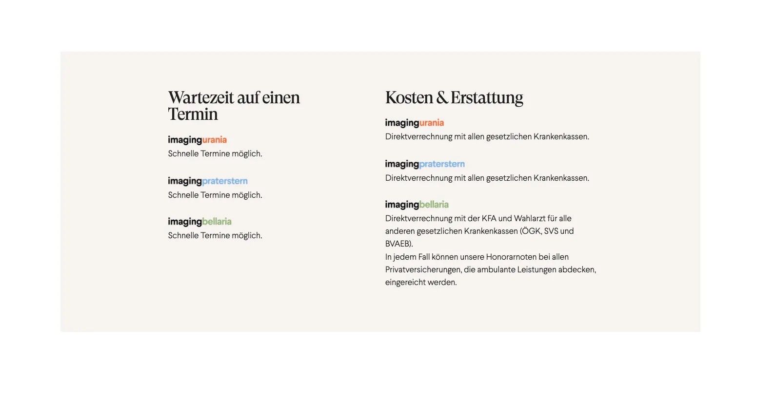 Wir entschieden uns dafür, pro Untersuchung eine zentrale Seite zu publizieren, aus der hervorgeht, welche Institute diese durchführen. So sehen PatientInnen schnell, dass ein MRT bei imagingUrania und imagingBellaria möglich ist. Dadurch, dass imagingPraterstern in dieser Section nicht genannt wird, ist klar, dass diese Untersuchung dort nicht angeboten wird.