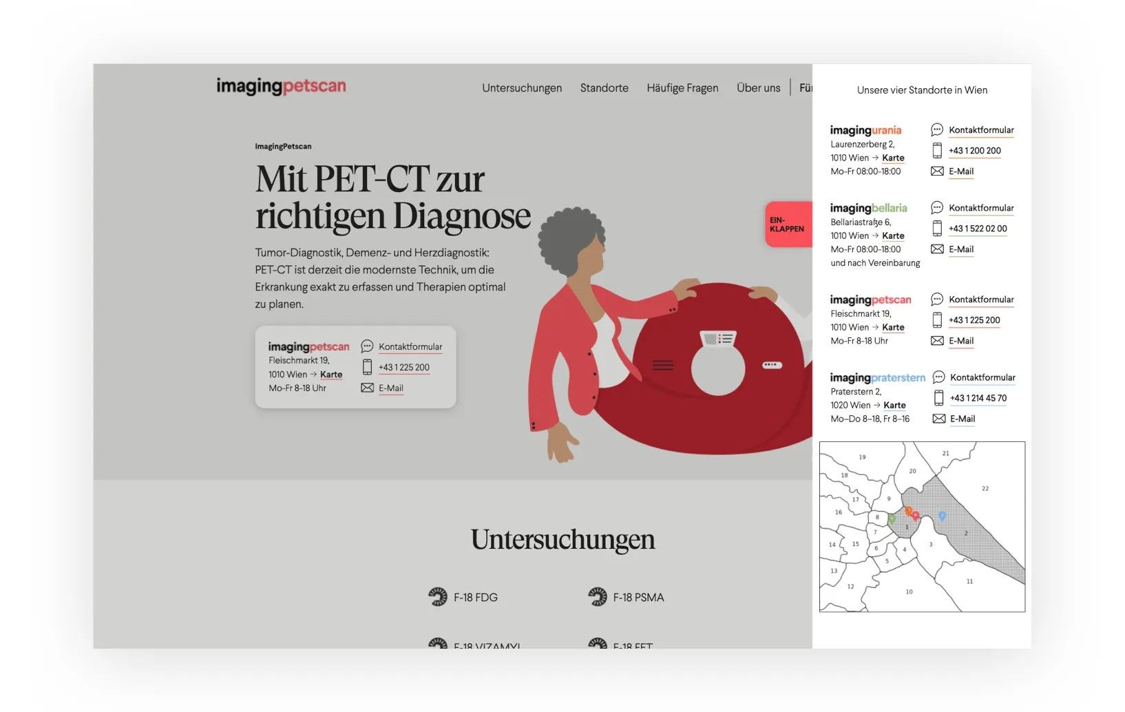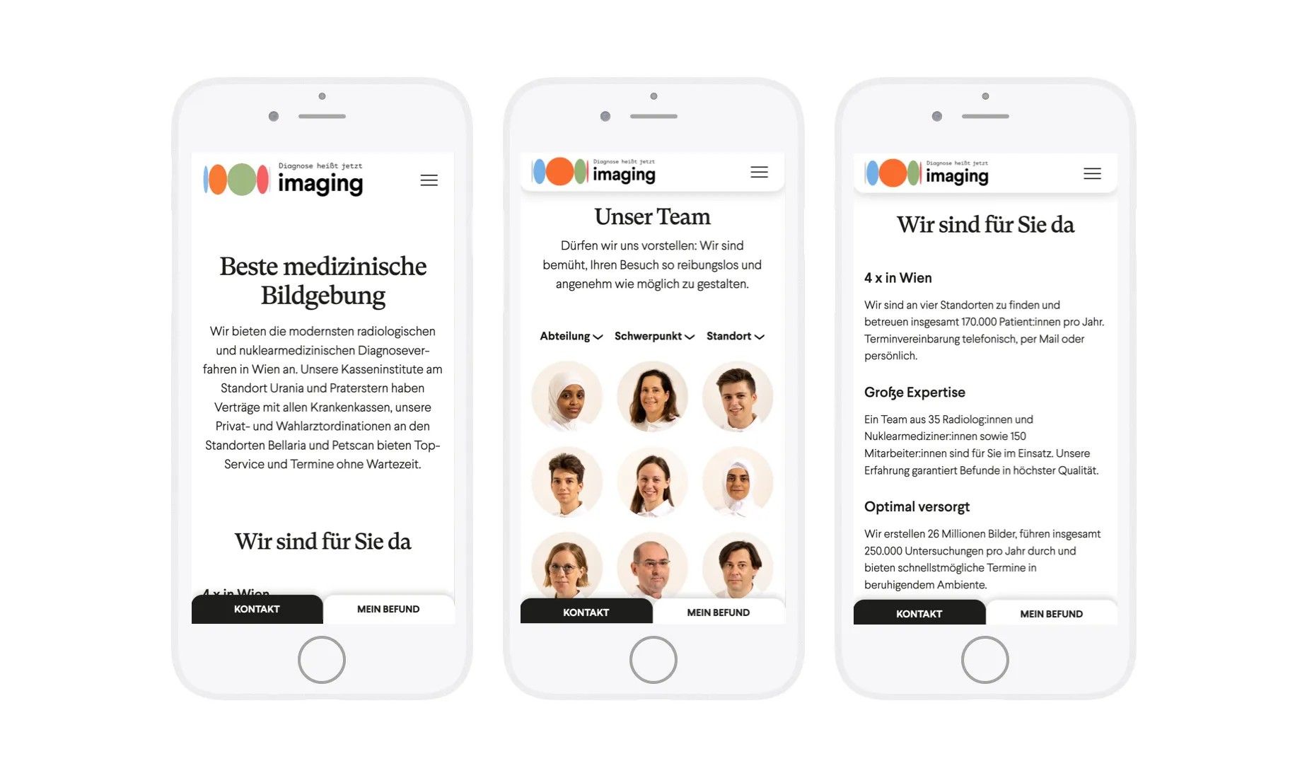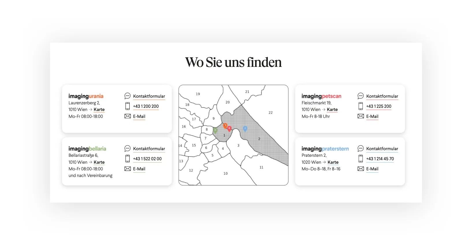 Auf der Startseite stehen diese Informationen an zwei Stellen: direkt im Header der Seite und unter dem Ankerlink-Menü „Standorte“. Dabei sehen UserInnen eine Karte aus der die ungefähre Location der Institute hervorgeht, und vier Kacheln mit essentiellen Informationen pro Standort. So wird auf eine schnelle und elegante Art und Weise kommuniziert, dass imaging an vier Standorten vertreten ist. Die Terminvereinbarung ist dadurch ebenso vereinfacht, da alle Kontakte und Standorte auf einen Blick zu sehen sind und der Anruf bei einem der Standorte nur einen Klick entfernt ist.
