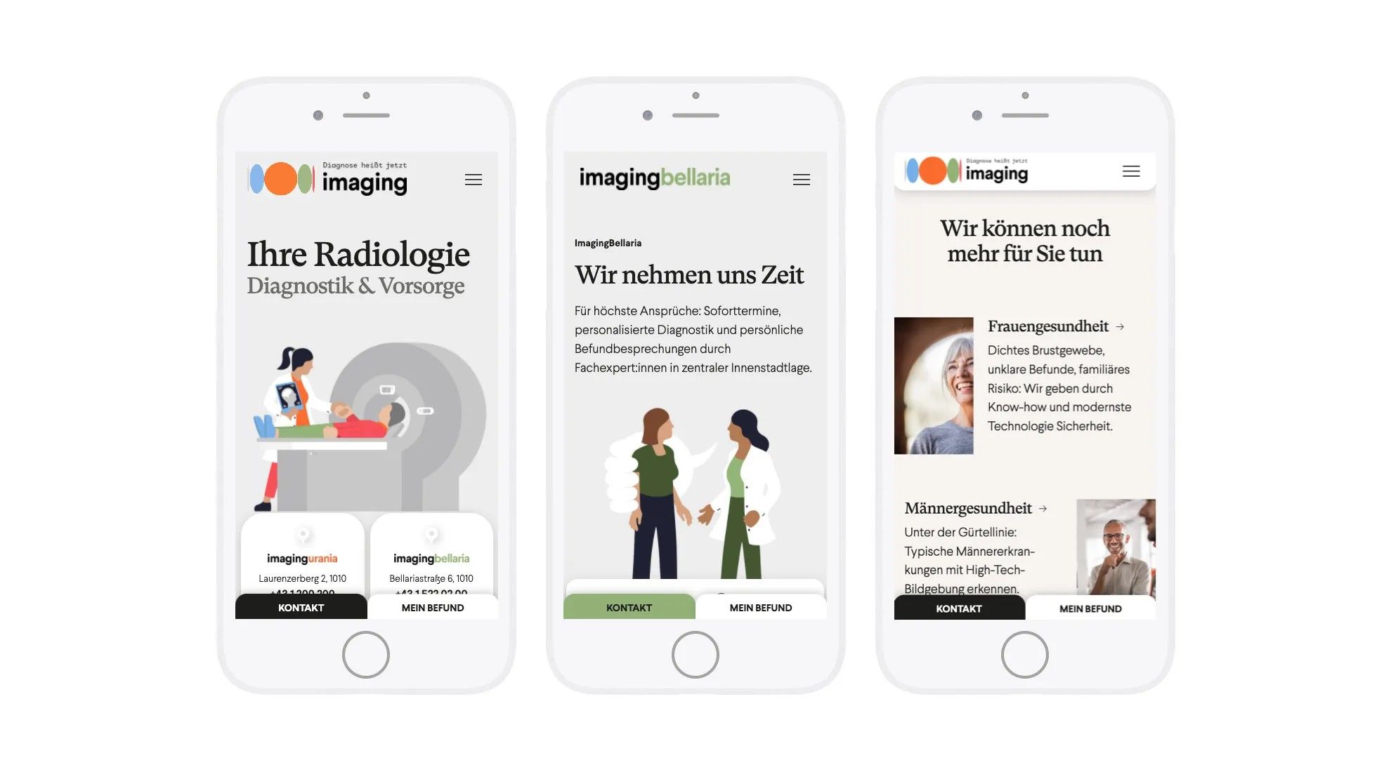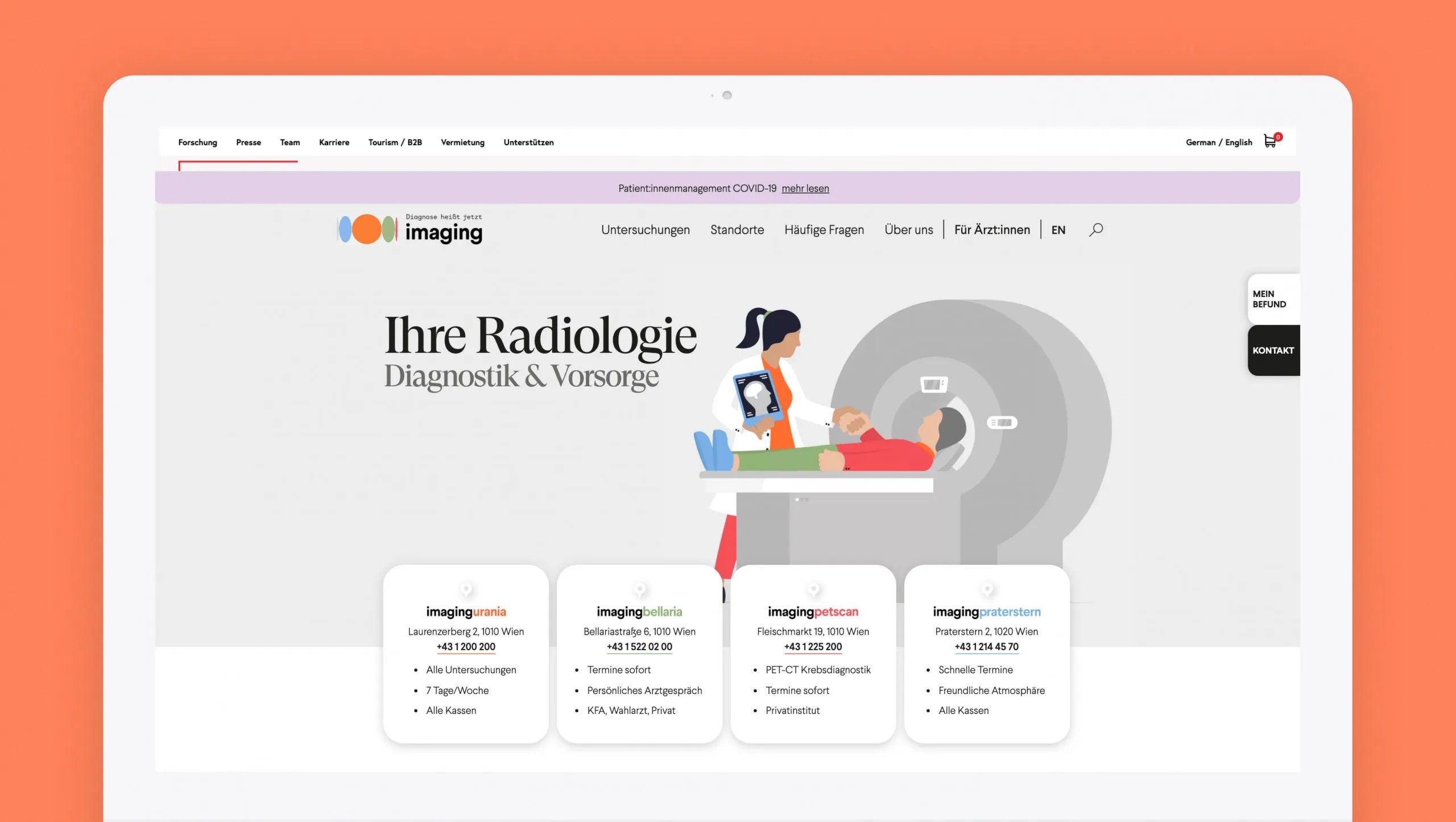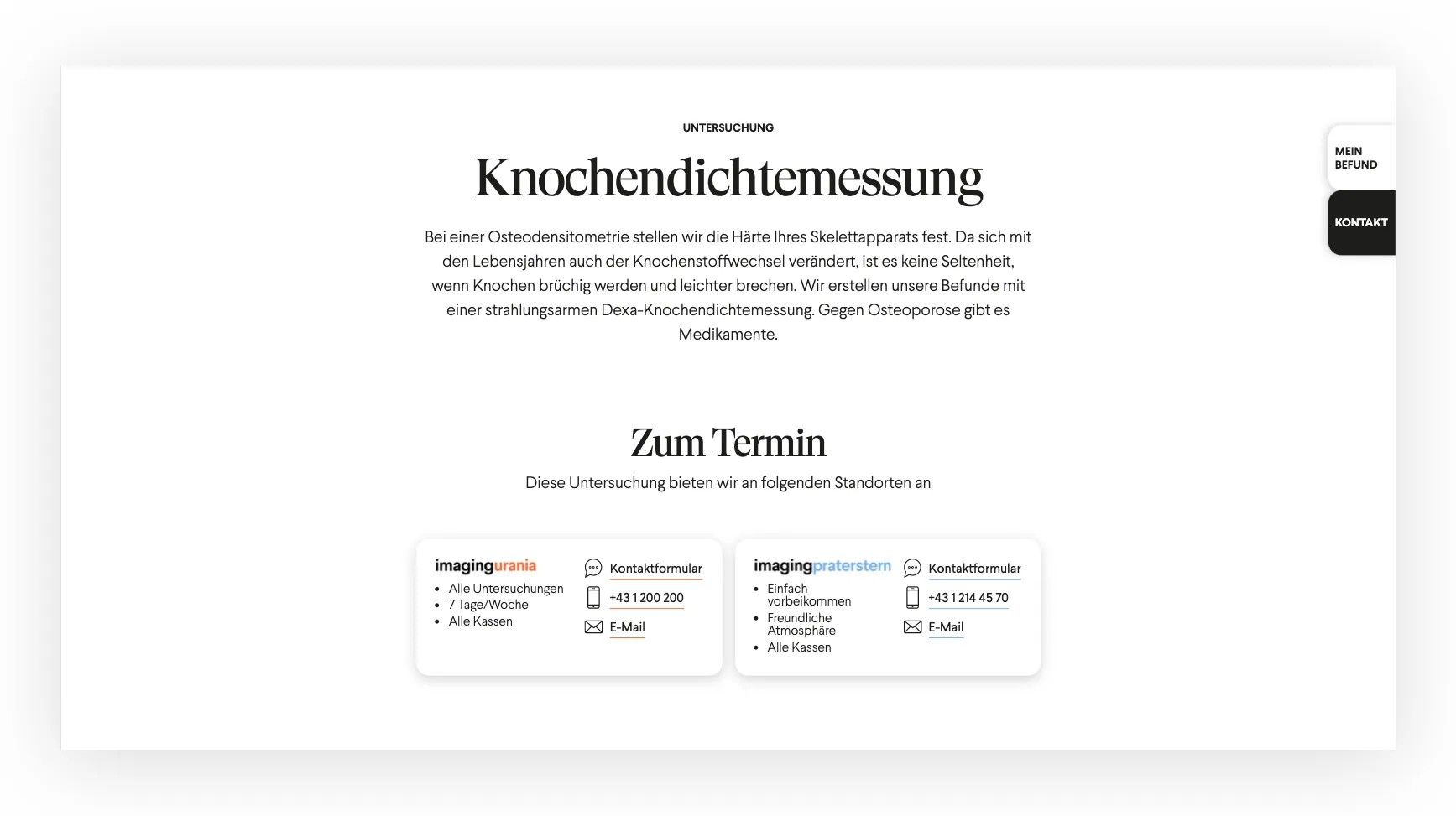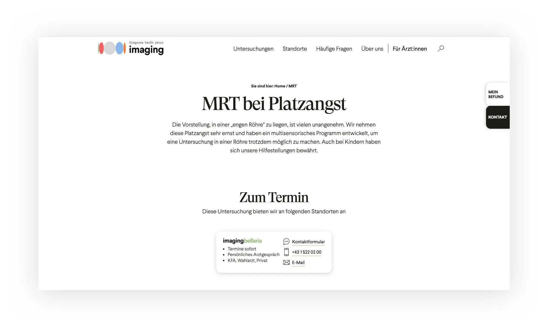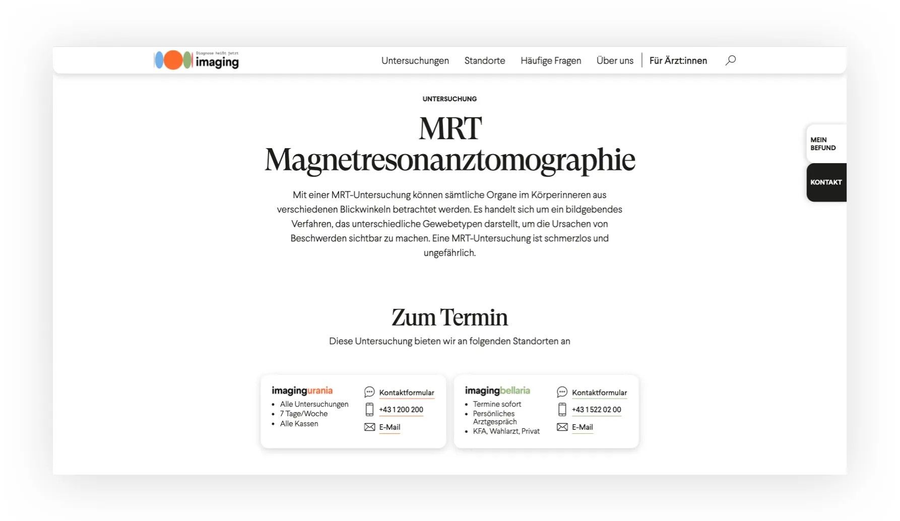 Meist werden PatientInnen von ihren Ärzt:Innen an Radiologieinstitute überwiesen, um Befunde für eine weiterführende Diagnose zu erhalten. Die wichtigste Funktionalität auf der neuen imaging-Seite ist es daher, eine einfache Kontaktmöglichkeit für die Terminbuchung zu bieten.