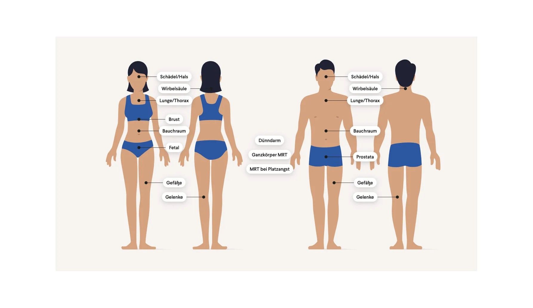 Mit Hilfe einer interaktiven Körpergrafik bilden wir zudem ab, welche Körperregionen mit Hilfe von MRT untersucht werden können, z.B. MRT Gelenke oder Ganzkörper MRT.