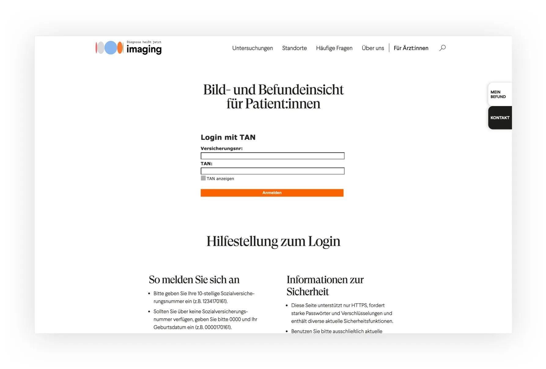 Nachdem PatientInnen bei imaging-Instituten waren, können sie auf der Website außerdem ihren Befund im speziell dafür vorgesehenen Loginbereich herunterladen. Dafür haben wir die Lasche „Mein Befund“ eingeführt, unter der PatientInnen ihren Befund mit einem Zugangscode herunterladen können. Während der Befundabruf aus Kundensicht einfach erscheint, passieren im Hintergrund komplexe Abläufe.