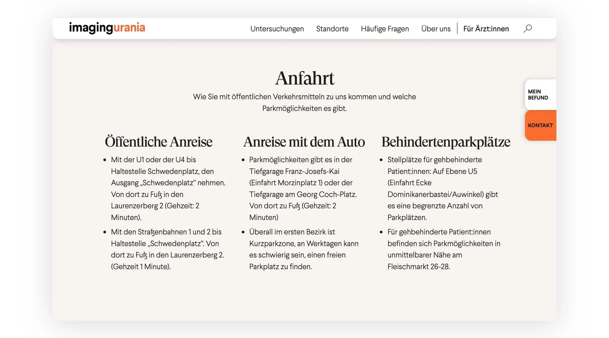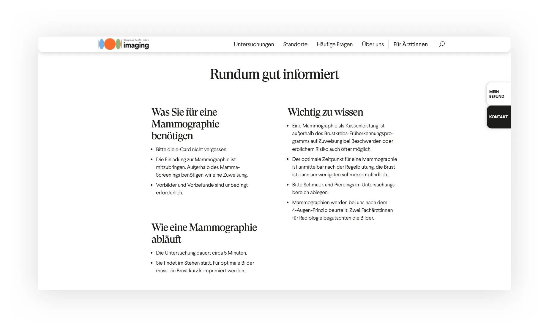 Unabhängig davon, ob UserInnen also von der Startseite oder einer Untersuchungsseite einsteigen, sie finden schnell die Kontaktmöglichkeiten der Institute, um einen Termin zu vereinbaren.
