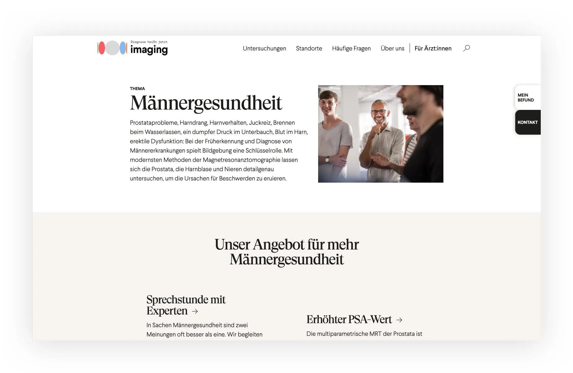 So wird das sensible Thema „Prostatakrebs“ zum Beispiel auf der Seite „Männergesundheit“ einleuchtend beschrieben und das Leistungsspektrum von imaging dazu abgebildet.