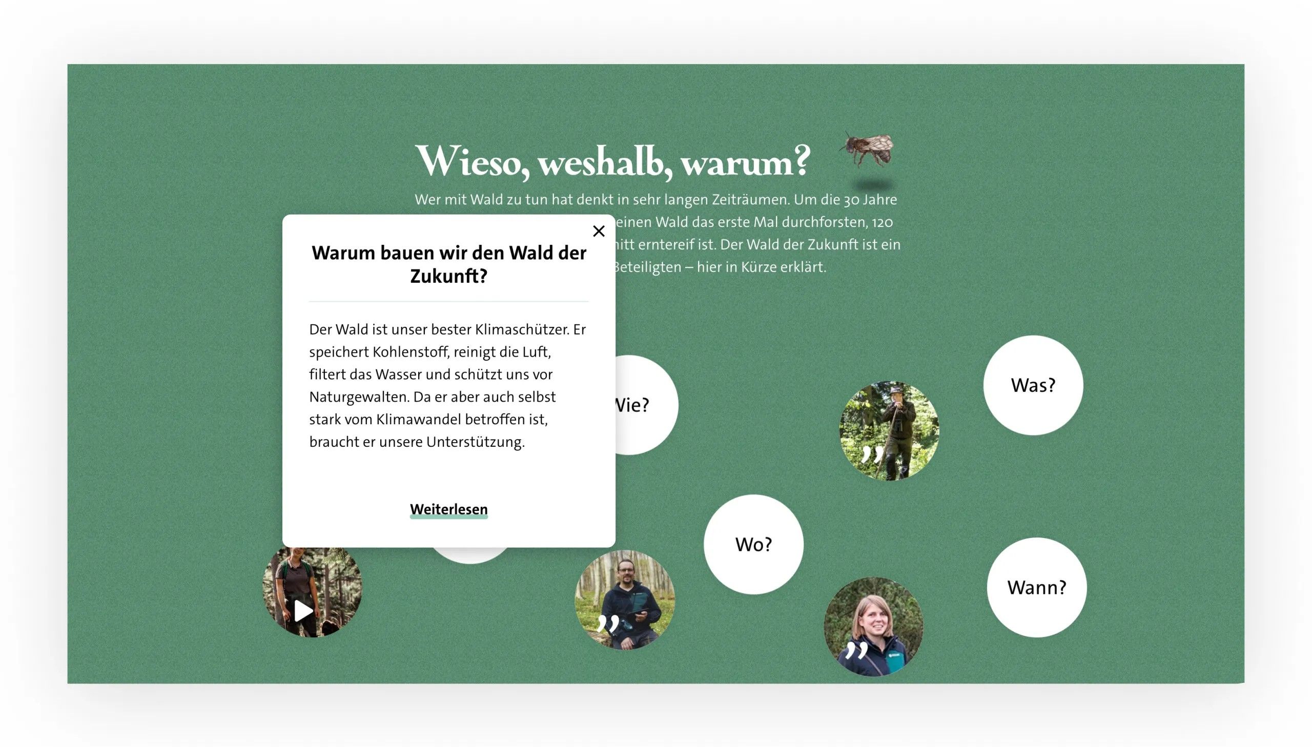 Was genau ist der Wald der Zukunft, wer ist die Bundesforste, was sollte man zu diesem Jahrhundertprojekt wissen? In diesem interaktiven Abschnitt auf der Website werden alle wichtigen W-Fragen beantwortet. Zu jeder Frage gibt es auch eine Unterseite, wo das Thema noch ausführlicher behandelt wird.
