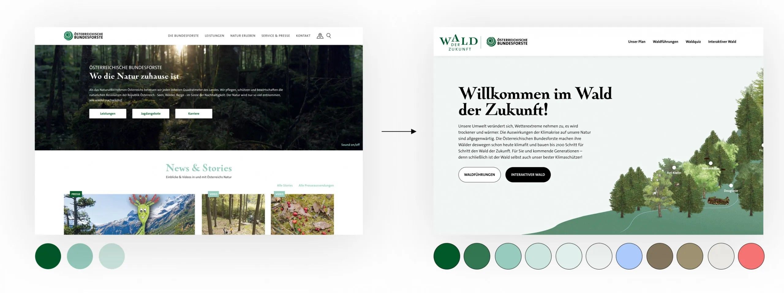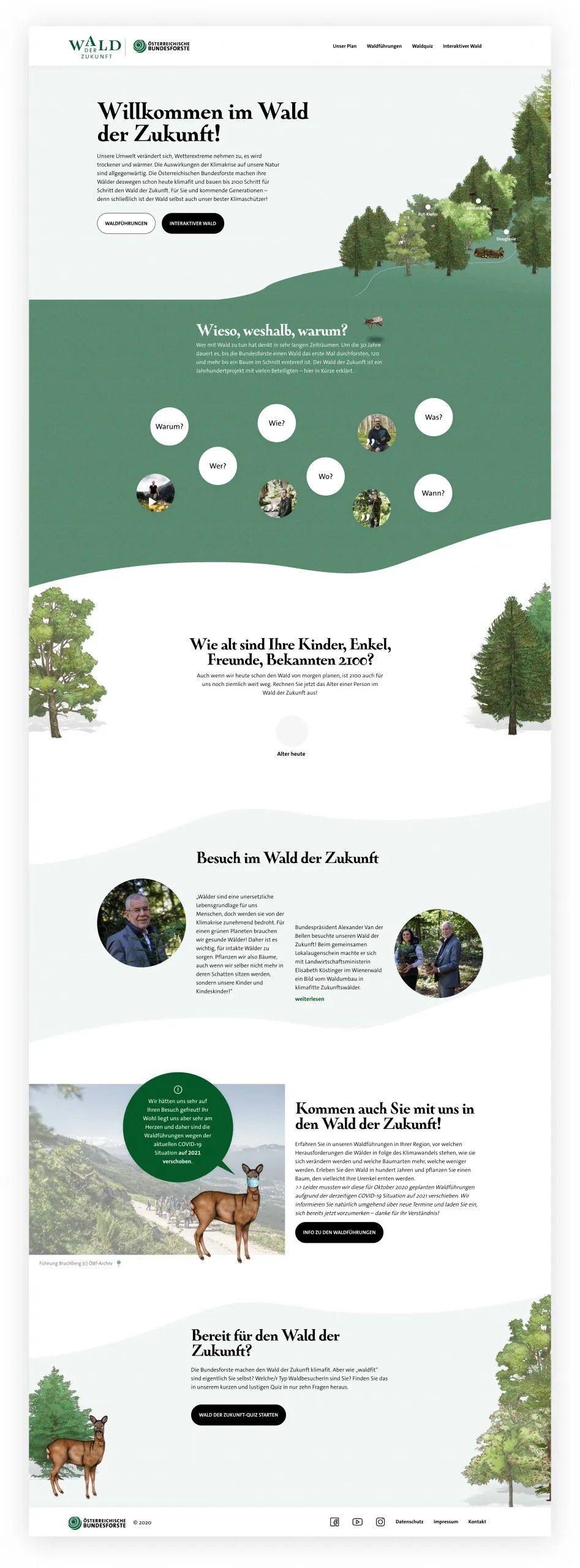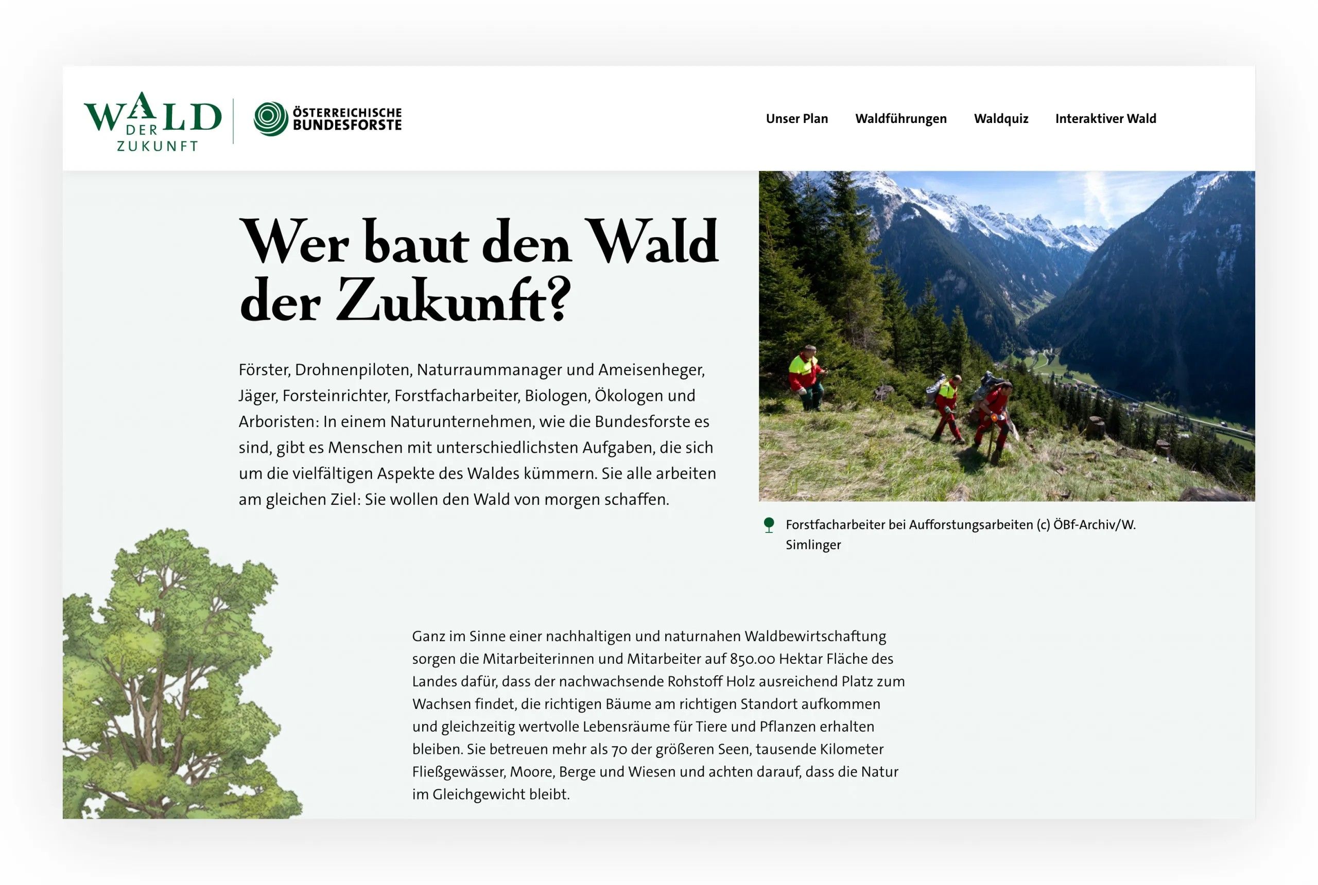 Die Bundesforste hat bereits eine definierte CI, die wir schon für den Website-Relaunch der Hauptseite verwendeten. Die neue Themenseite sollte optisch zum Unternehmen gehören, sich aber doch etwas abheben. Das Logo „Wald der Zukunft“ lag bereits vor.